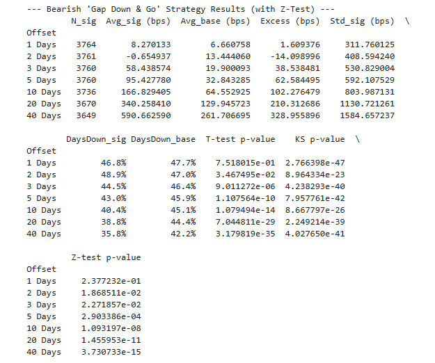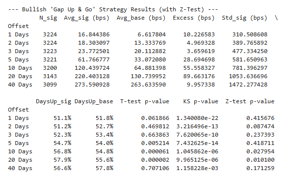 print("\n--- Bullish 'Gap Up & Go' Strategy Results (with Z-Test) ---")
